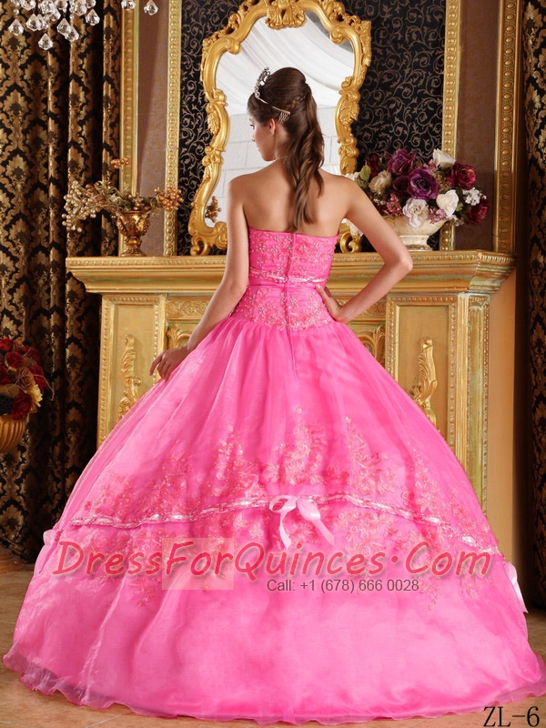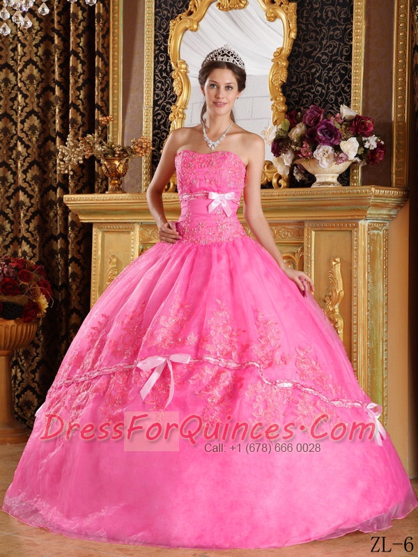 Affordable Rose Pink Ball Gown Strapless Appliques Organza For Sweet 16 Dresses