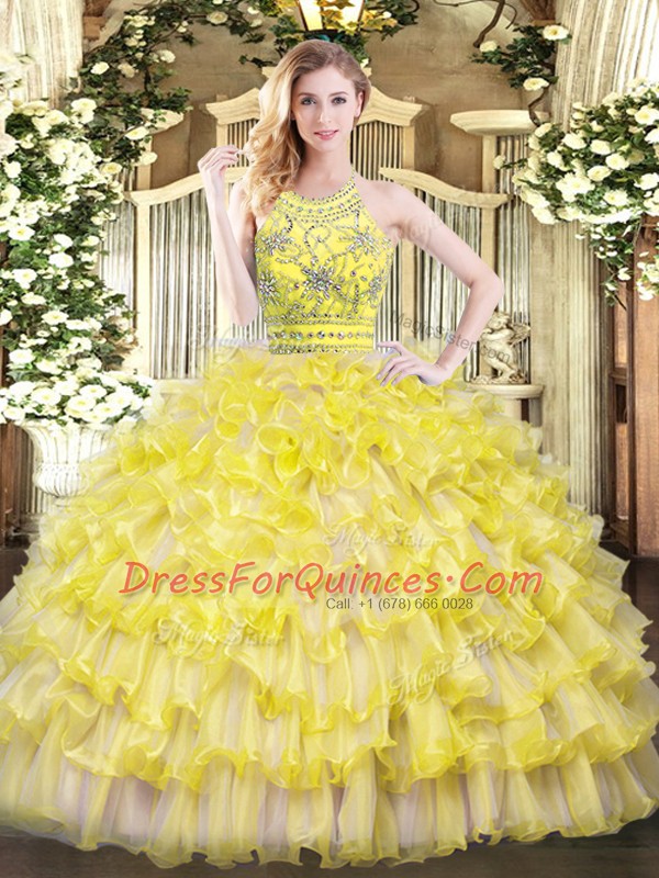 Beading and Ruffles Quinceanera Dress Gold Zipper Sleeveless Floor Length