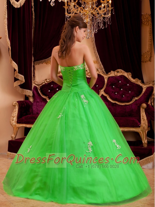 Beautiful Spring Green A-line / Princess Strapless Floor-length Appliques Tulle For Sweet 16 Dresses