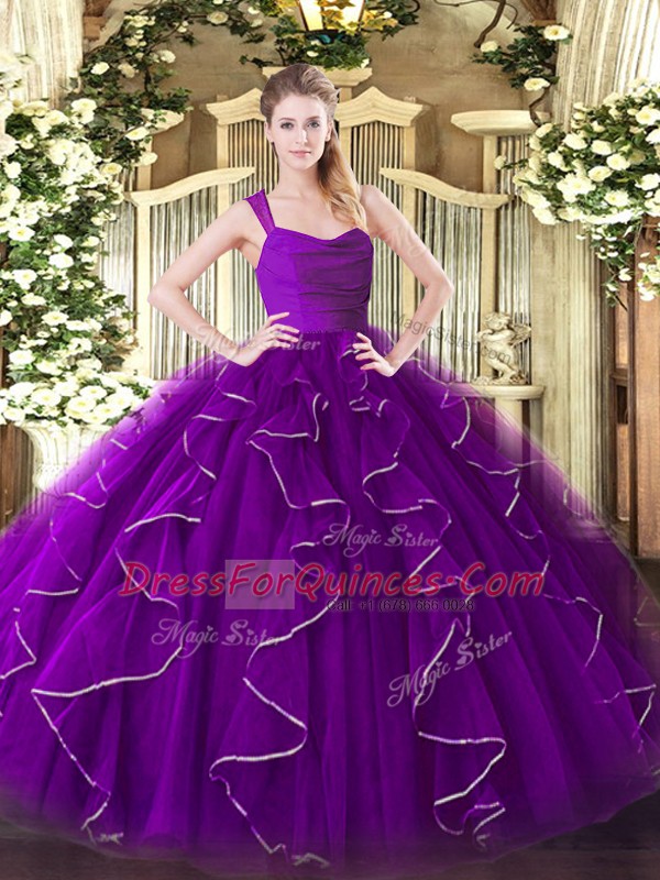 Decent Straps Sleeveless Sweet 16 Dresses Floor Length Ruffles Eggplant Purple Organza