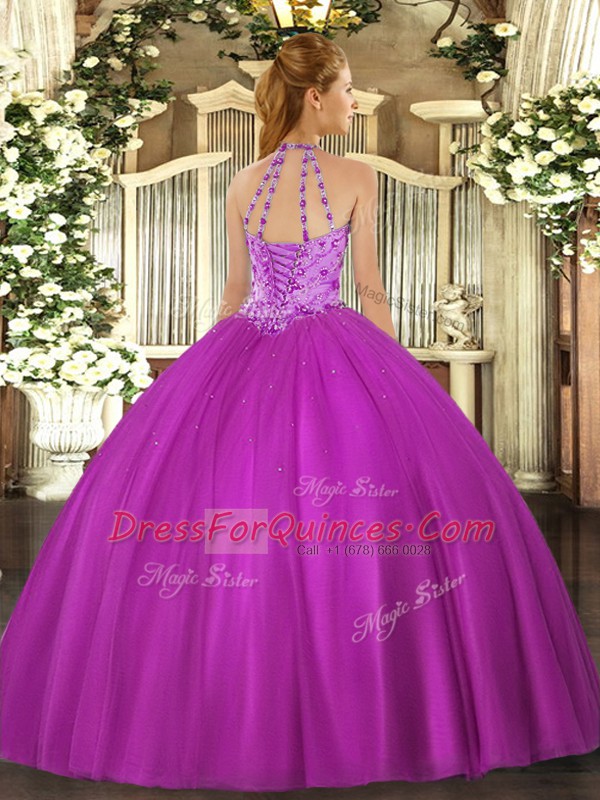 Dramatic Fuchsia Ball Gowns Satin Halter Top Sleeveless Beading Floor Length Lace Up Quince Ball Gowns
