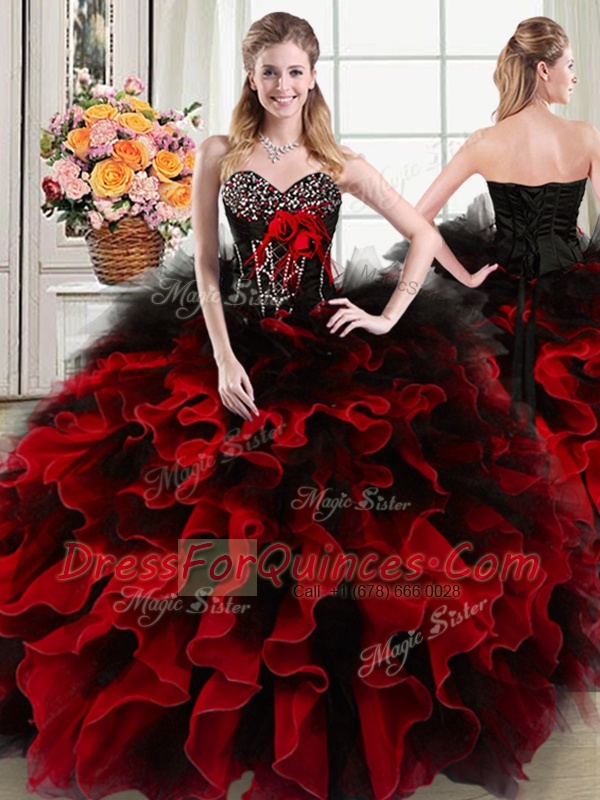 Dynamic Black and Red Sleeveless Floor Length Beading and Ruffles and Hand Made Flower Lace Up Quinceanera Gowns