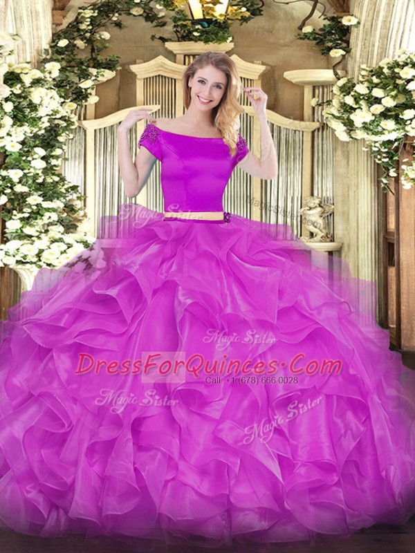 Extravagant Fuchsia Organza Zipper Ball Gown Prom Dress Short Sleeves Floor Length Appliques and Ruffles