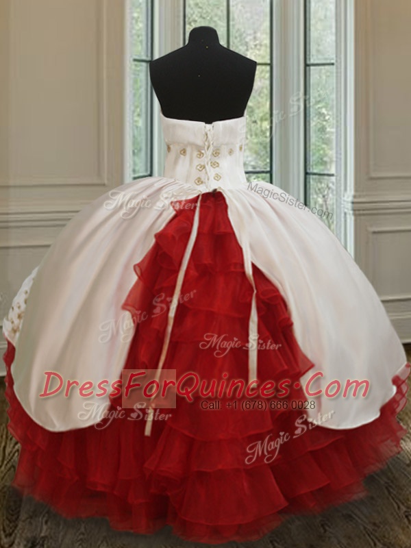Fancy Floor Length Lace Up 15 Quinceanera Dress White and Red for Military Ball and Sweet 16 and Quinceanera with Beading and Embroidery and Ruffled Layers