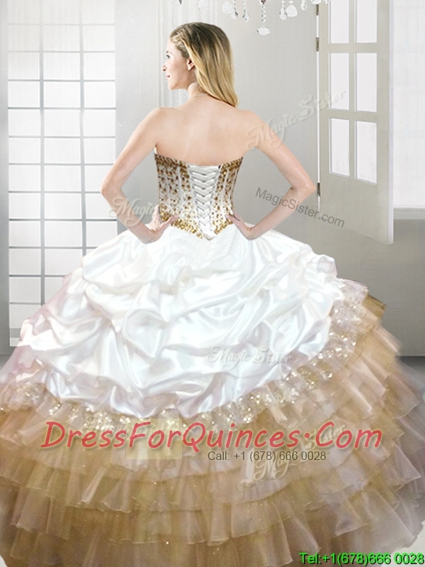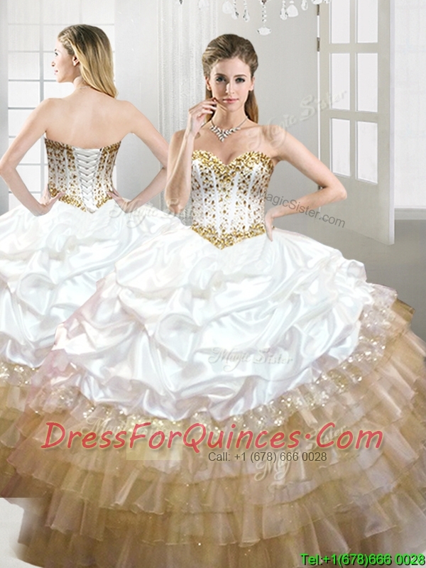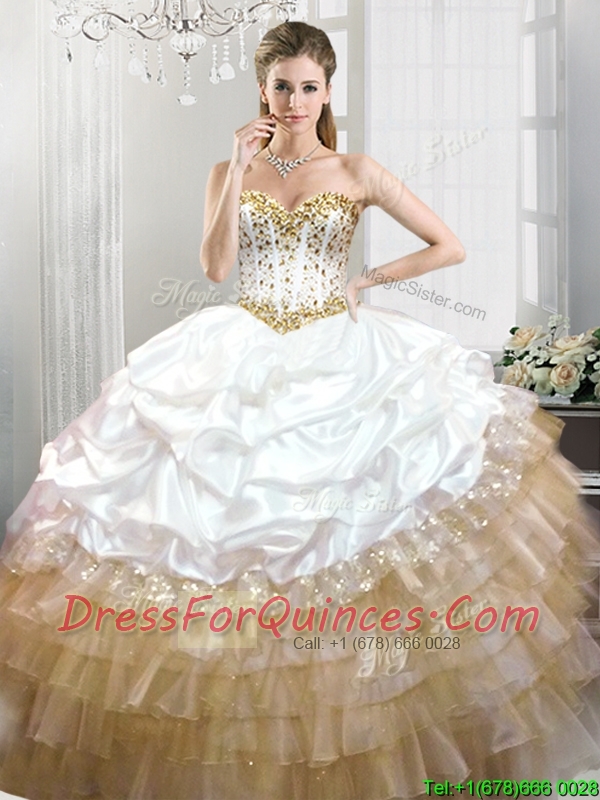 Fashionable Beaded and Pick Ups Quinceanera Dress in White and Gold