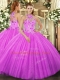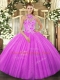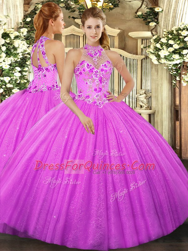 Fuchsia Lace Up Halter Top Beading and Embroidery Sweet 16 Dress Tulle Sleeveless