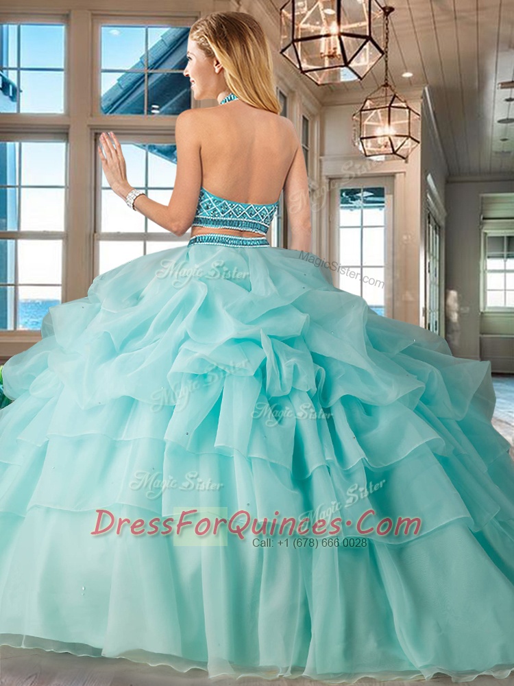 Glamorous Aqua Blue Two Pieces Halter Top Sleeveless Organza Brush Train Backless Beading and Ruffled Layers and Pick Ups Sweet 16 Dress