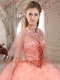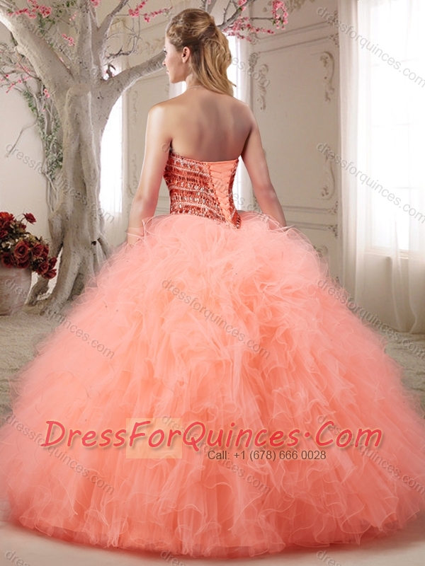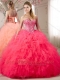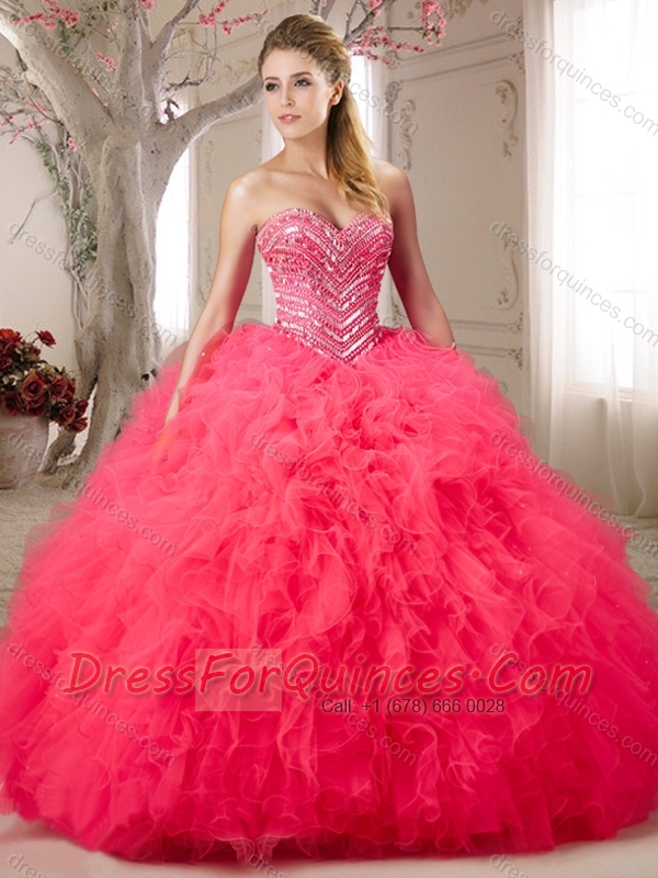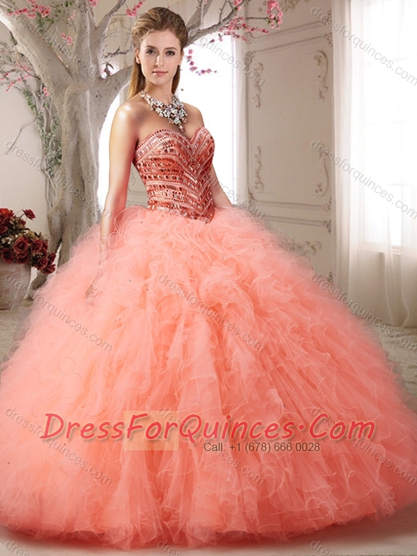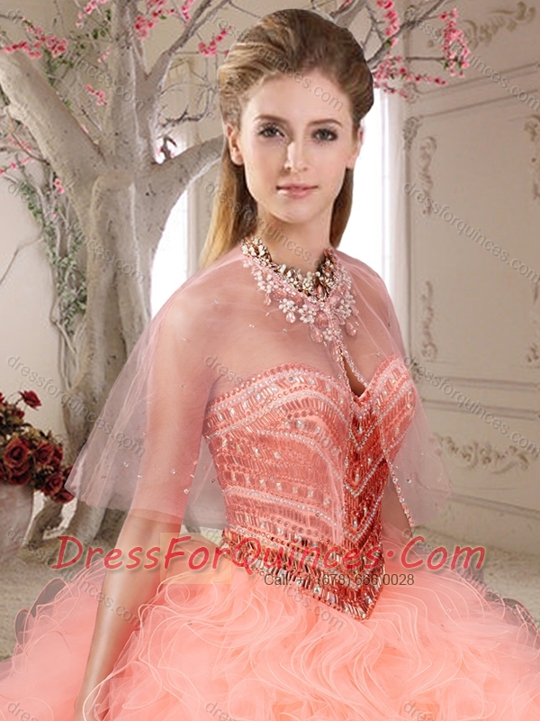 Gorgeous Beaded and Ruffled Sweetheart Coral Red Quinceanera Gown in Organza