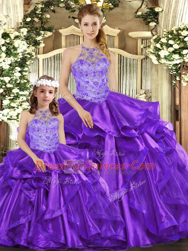 Gorgeous Halter Top Sleeveless Organza Sweet 16 Quinceanera Dress Beading and Ruffles Lace Up