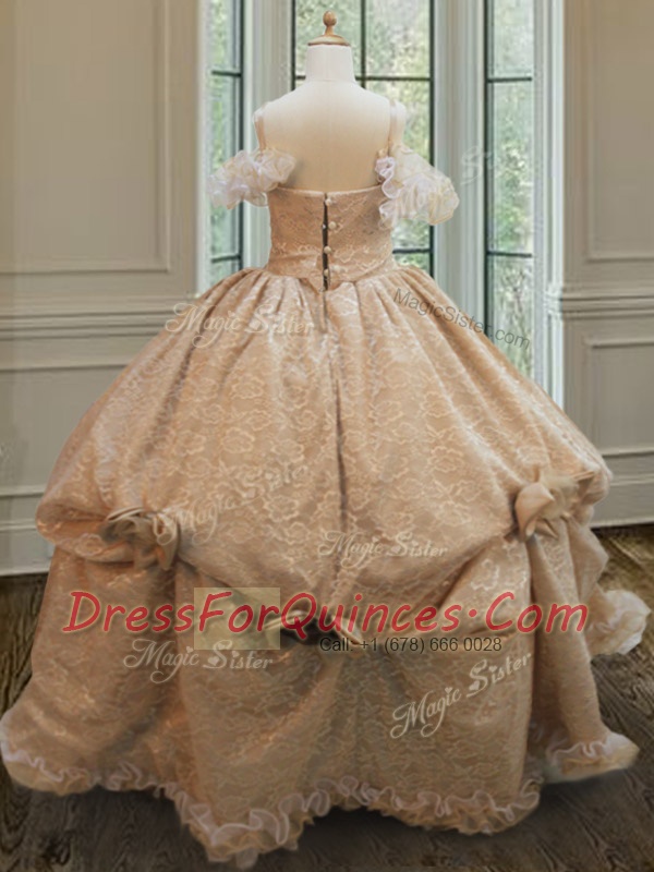Gorgeous Off the Shoulder Floor Length Zipper Sweet 16 Quinceanera Dress Champagne for Military Ball and Sweet 16 and Quinceanera with Lace and Ruffles and Hand Made Flower