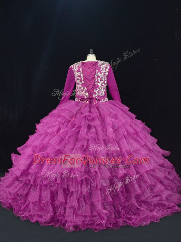 High Class Purple Ball Gowns Beading and Ruffled Layers Sweet 16 Quinceanera Dress Lace Up Organza Long Sleeves Floor Length