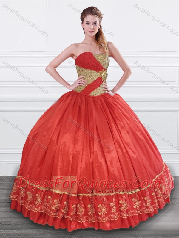 Latest Beaded and Applique Taffeta Sweet 16 Dress in Red and Gold