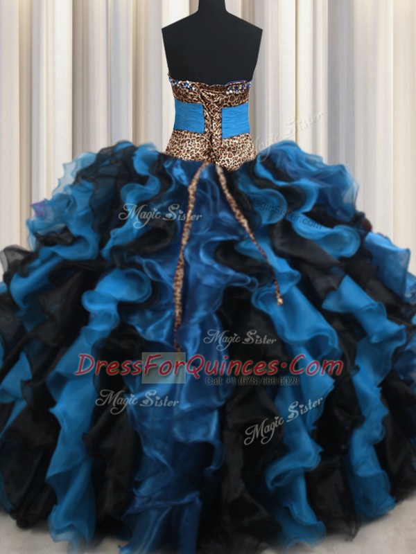 Leopard Two Tone V Neck Floor Length Ball Gowns Sleeveless Blue And Black Quinceanera Gown Lace Up