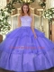 Luxury Lavender Organza Clasp Handle Quinceanera Dresses Sleeveless Floor Length Lace and Ruffled Layers