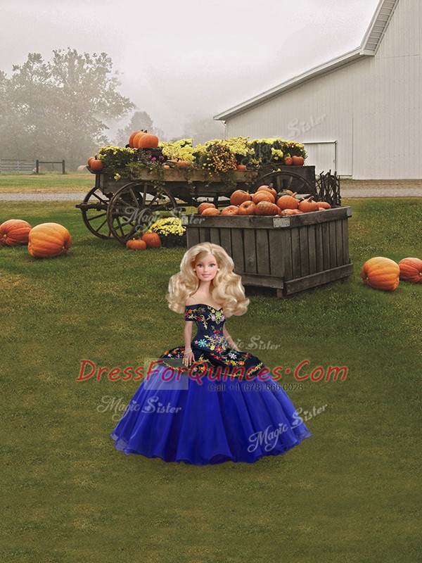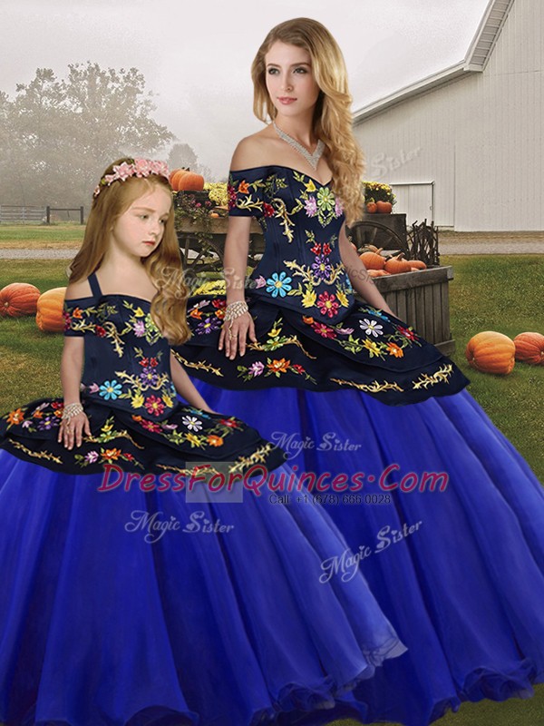 Modern Royal Blue Lace Up Off The Shoulder Embroidery Quinceanera Gown Tulle Sleeveless