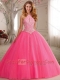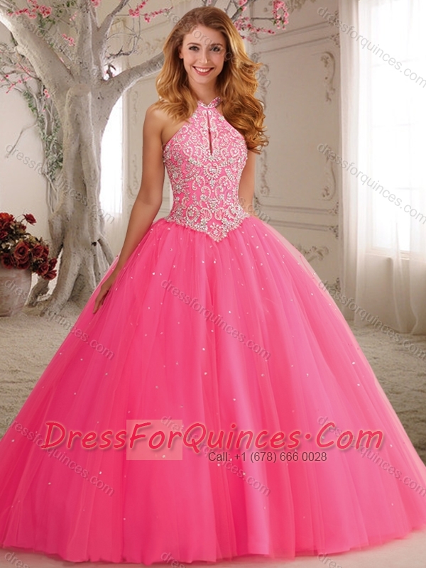 Modest Cutout Bust Beaded Decorated High Neck Hot Pink Quinceanera Dress