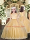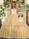 Modest Gold Tulle Clasp Handle Scoop Sleeveless Floor Length Quinceanera Gowns Lace and Appliques