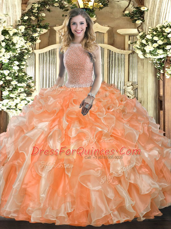 Modest Orange Red Quinceanera Dress Military Ball and Sweet 16 and Quinceanera with Beading and Ruffles High-neck Sleeveless Lace Up