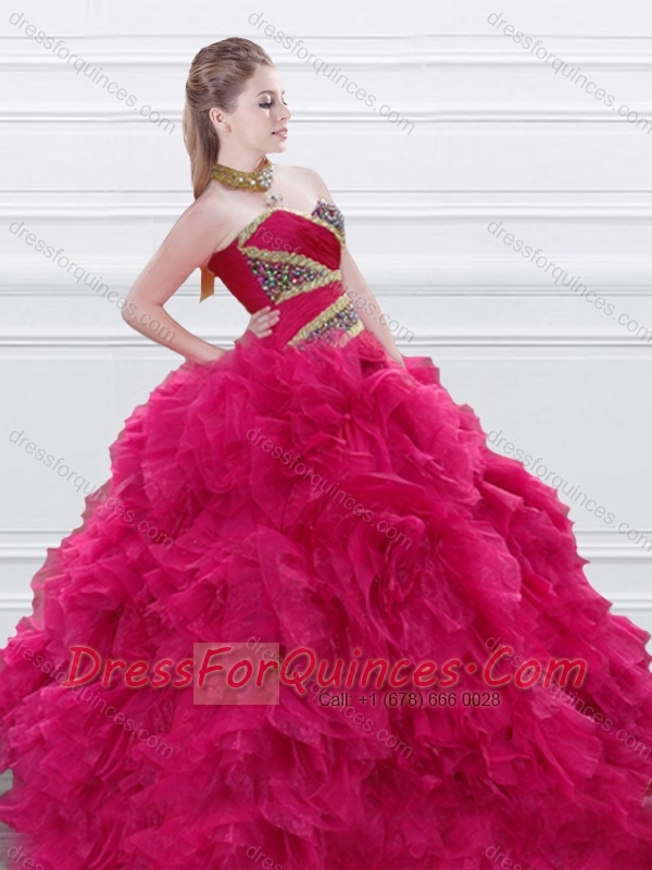 New Style Beaded and Ruffled Red Sweet 16 Dress in Tulle