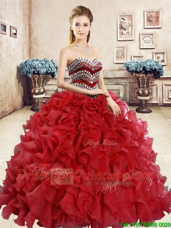 New Style Organza Red Sweet 16 Dress with Beading and Ruffles