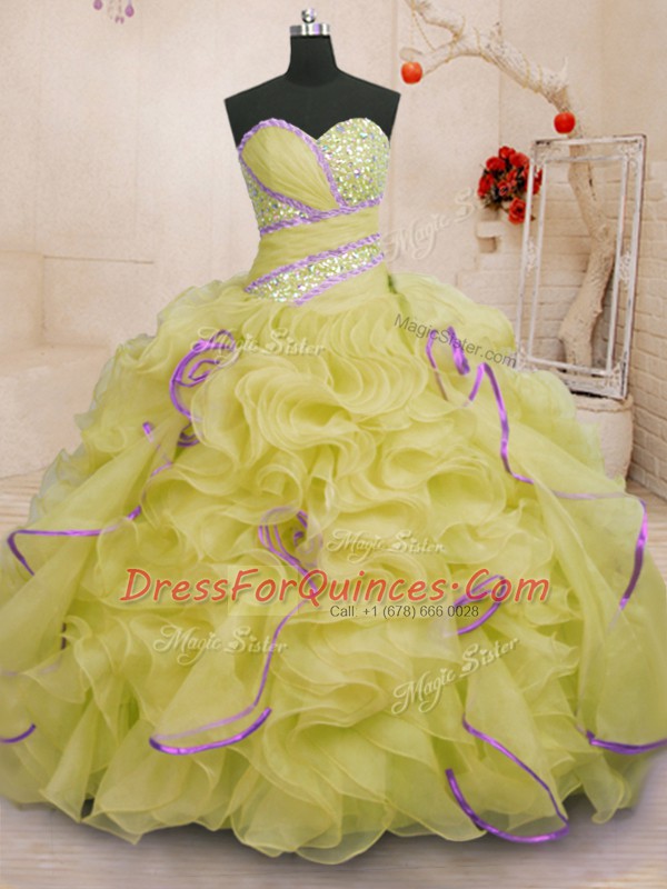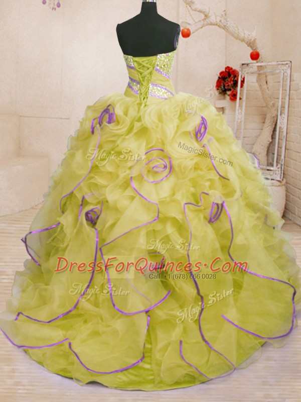 On Sale Yellow Organza Lace Up Sweet 16 Quinceanera Dress Sleeveless With Brush Train Beading and Ruffles
