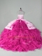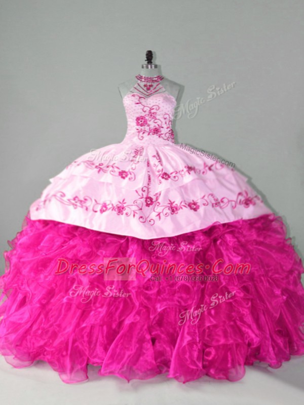 Organza Halter Top Sleeveless Court Train Lace Up Embroidery and Ruffles Quinceanera Dress in Hot Pink