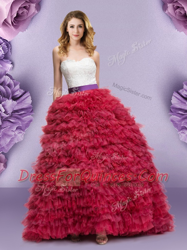 Perfect Wine Red Ball Gowns Sweetheart Sleeveless Tulle Floor Length Lace Up Lace and Ruffled Layers Quince Ball Gowns