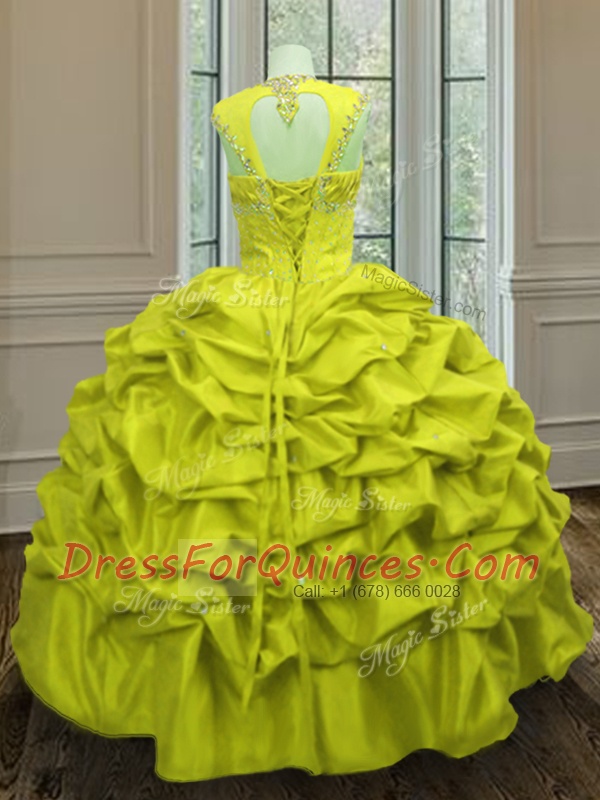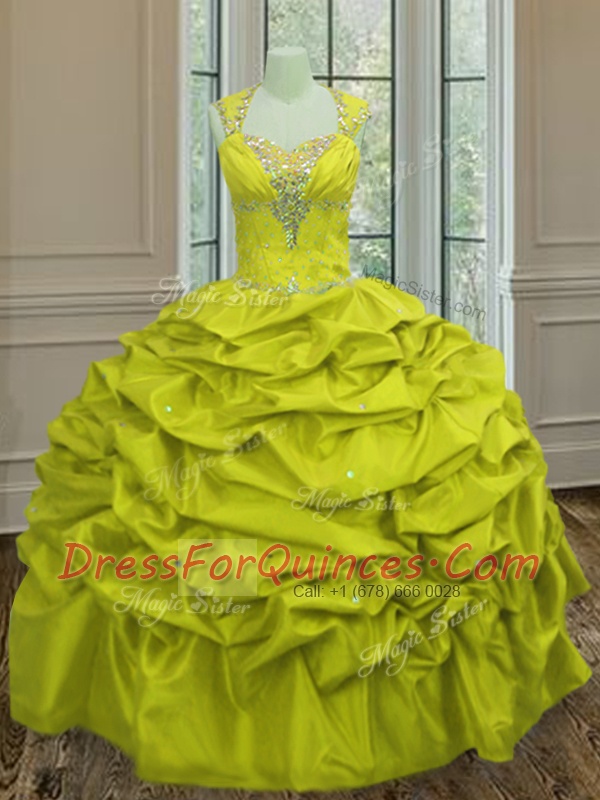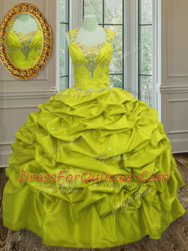 Pick Ups Straps Sleeveless Lace Up Ball Gown Prom Dress Yellow Green Taffeta