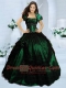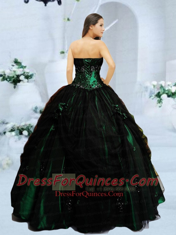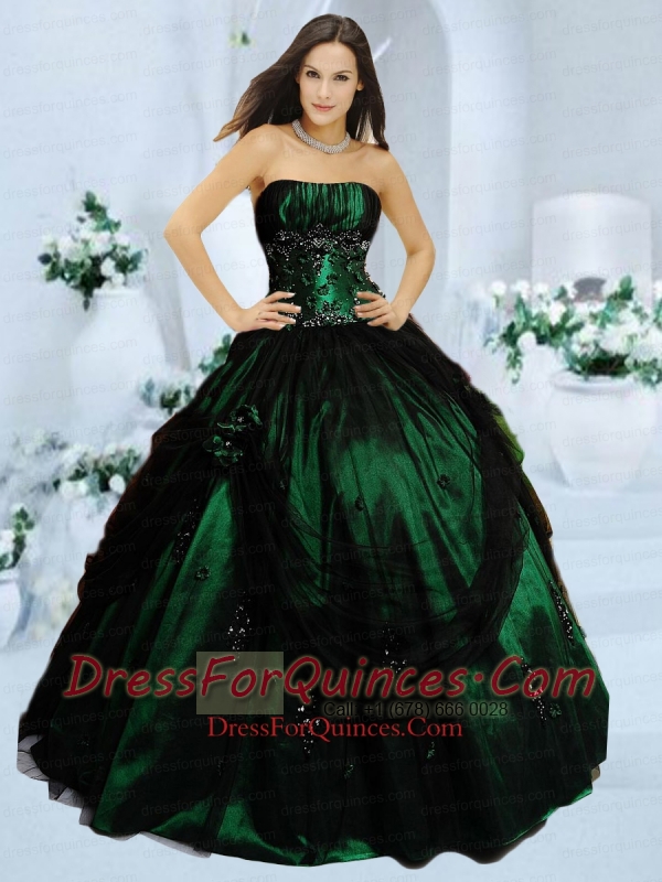 Popular Strapless Dark Green Quinceanera Dresses with Appliques and Hand Made Flower