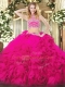 Sleeveless Tulle Floor Length Backless Sweet 16 Dress in Hot Pink with Beading and Ruffles