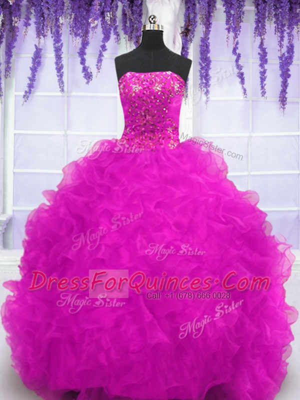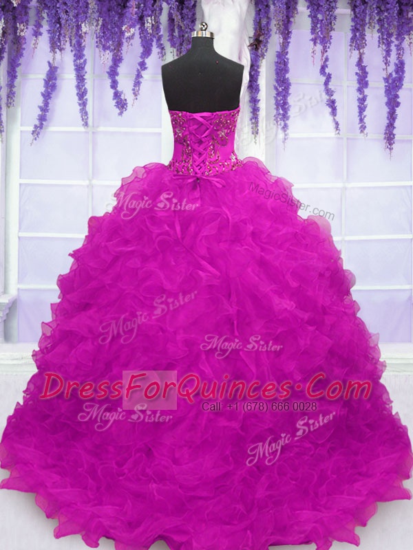Sleeveless With Train Beading and Appliques and Ruffles Lace Up 15 Quinceanera Dress with Fuchsia Brush Train