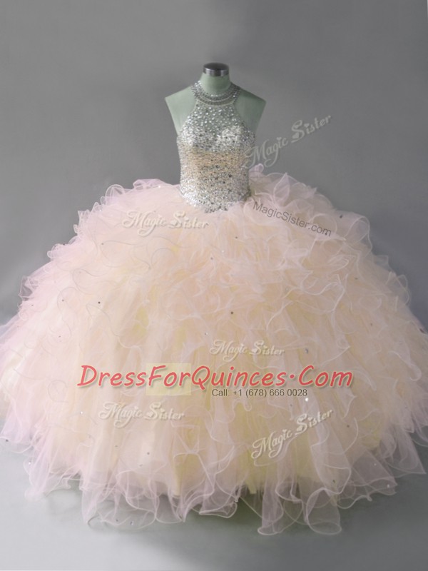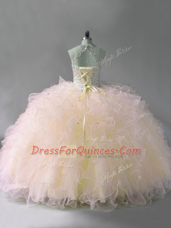 Sophisticated Pink Ball Gowns Tulle Halter Top Sleeveless Beading and Ruffles Floor Length Lace Up Quinceanera Gowns