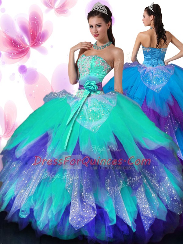 Sumptuous Multi-color Ball Gowns Tulle Sweetheart Sleeveless Appliques and Ruffled Layers and Hand Made Flower Floor Length Lace Up Quince Ball Gowns