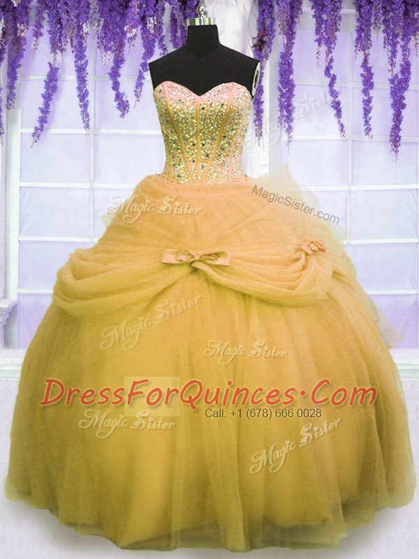 Superior Gold Lace Up Sweetheart Beading and Bowknot Vestidos de Quinceanera Tulle Sleeveless
