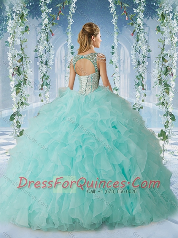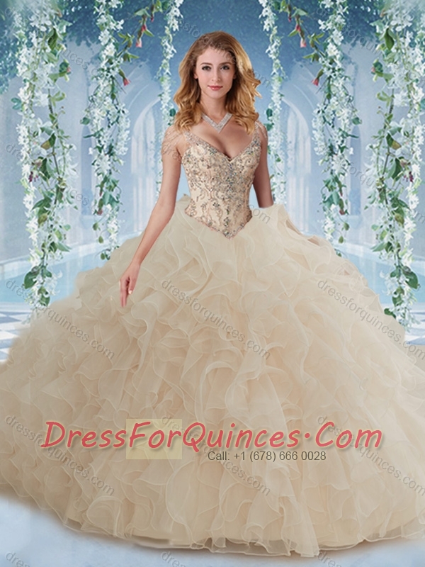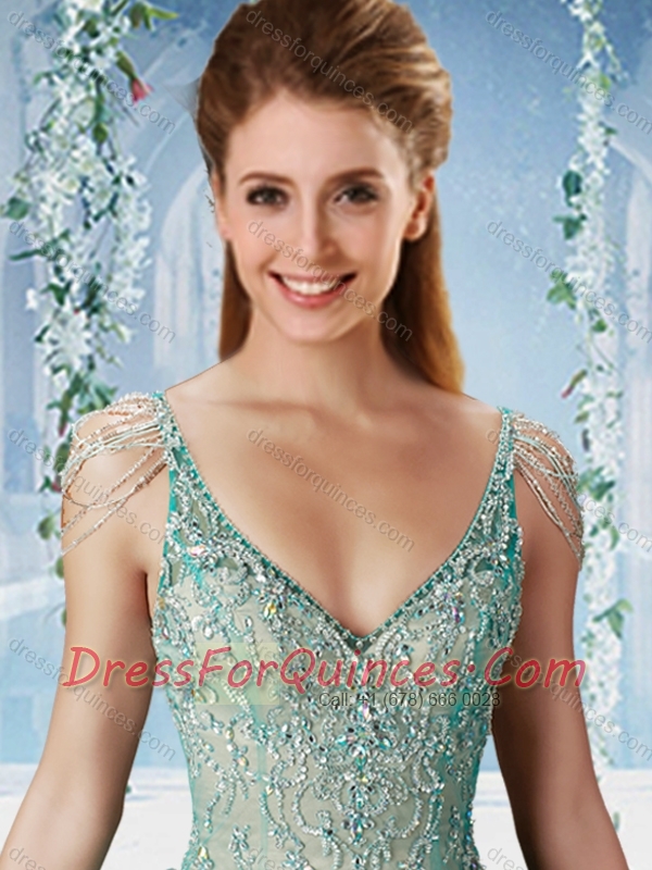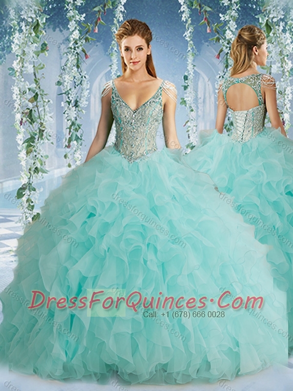 The Super Hot Beaded Decorated Cap Sleeves Sweet 16 Dresses with Deep V Neck