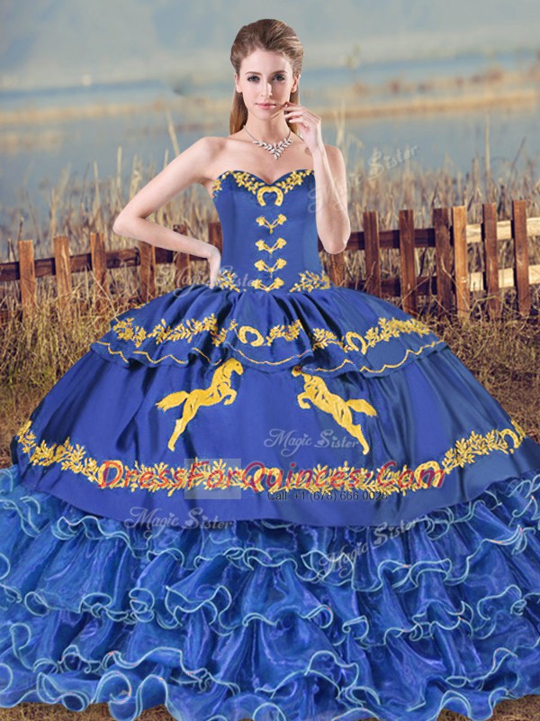 Vintage Sleeveless Embroidery and Ruffled Layers Lace Up Sweet 16 Quinceanera Dress with Blue Brush Train