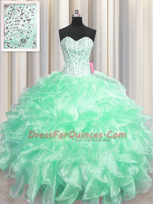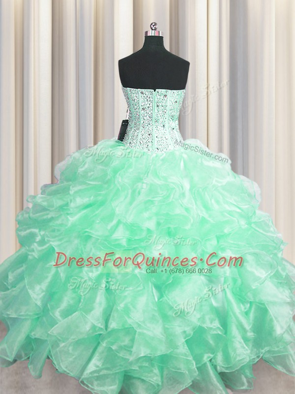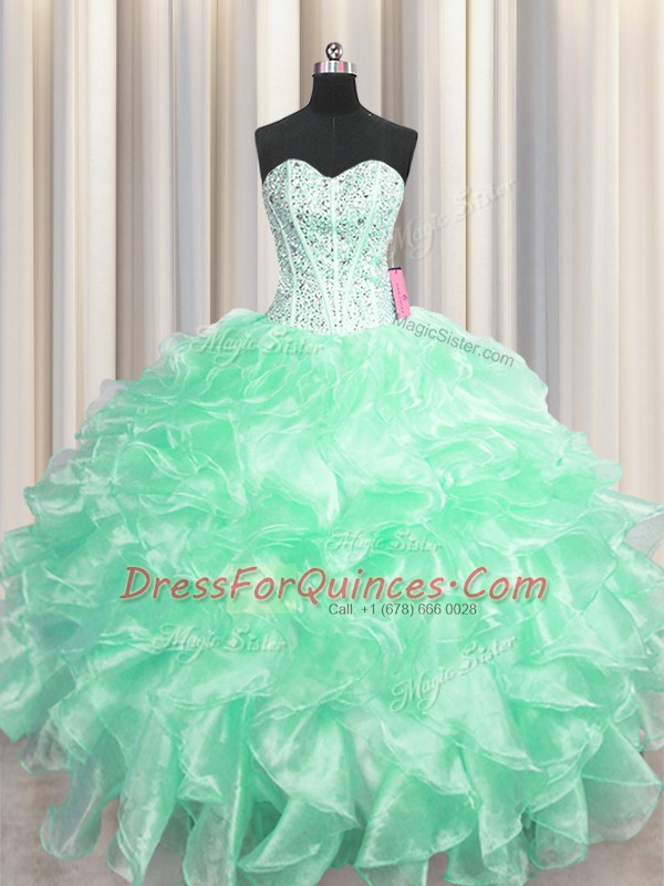 Vintage Visible Boning Apple Green Sleeveless Floor Length Beading and Ruffles Zipper Ball Gown Prom Dress