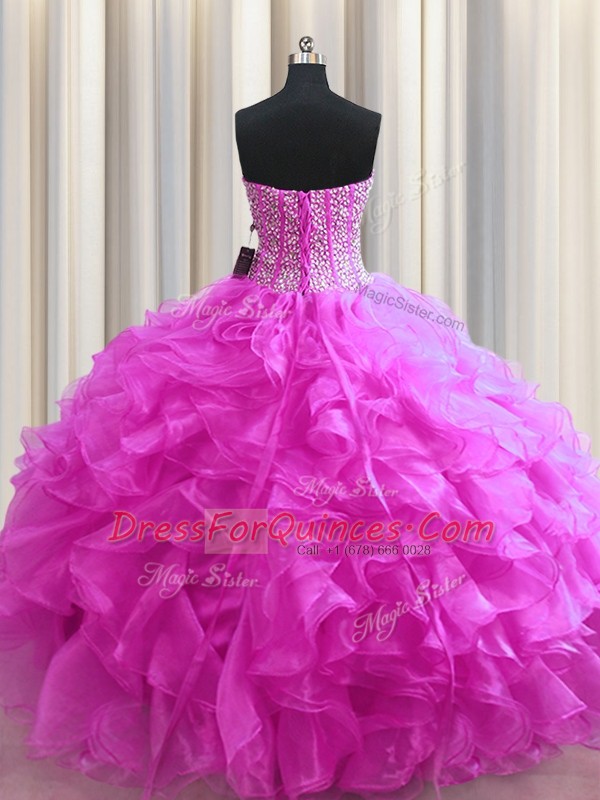 Visible Boning Fuchsia Organza Lace Up Sweet 16 Dresses Sleeveless Floor Length Beading and Ruffles
