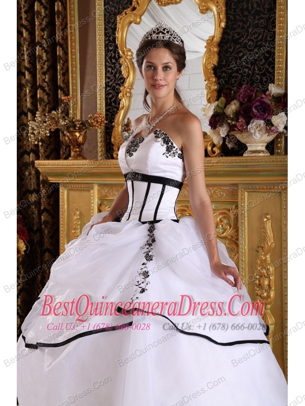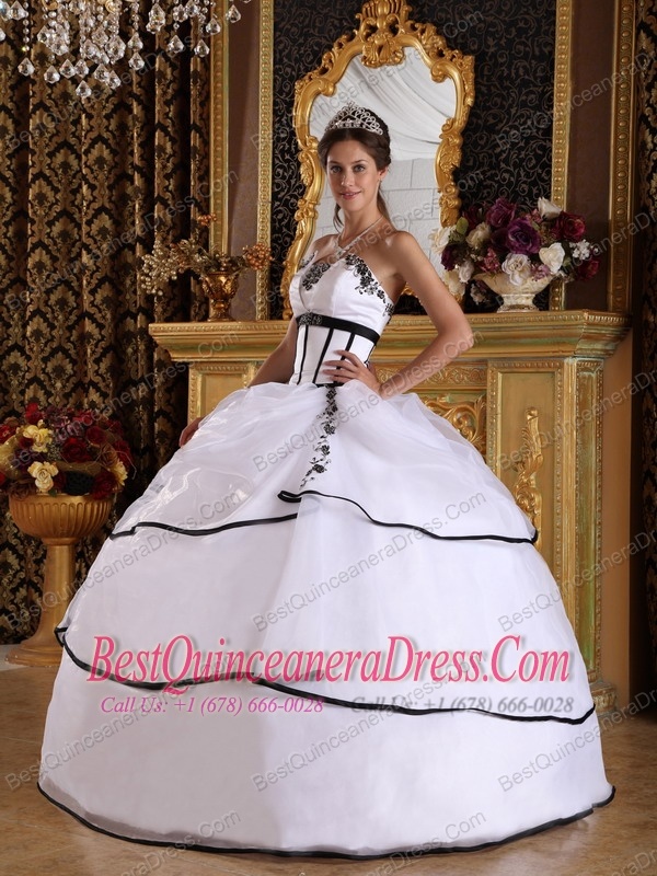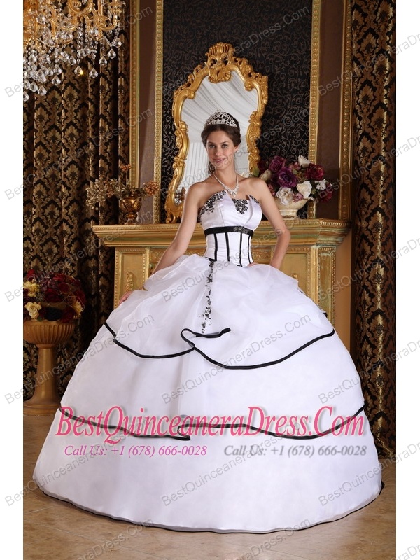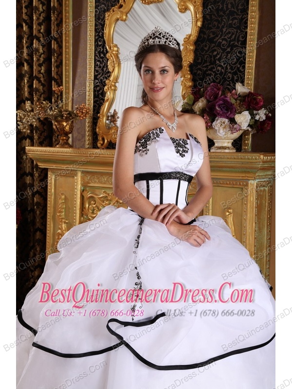 White Ball Gown Strapless Floor-length Satin and Organza Appliques Sweet 16 Dress