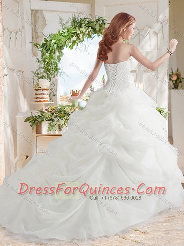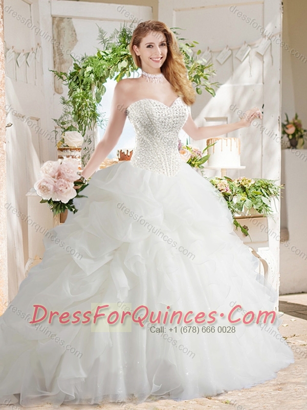 White Ball Gown Sweetheart Organza Court Train Beaded and Bubbles Quinceanera Dress