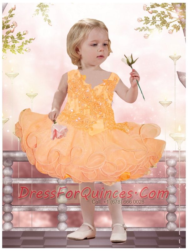 2015 Elegant A-Line Straps Little Girl Dresses with Appliques Beading Bowknot in Orange