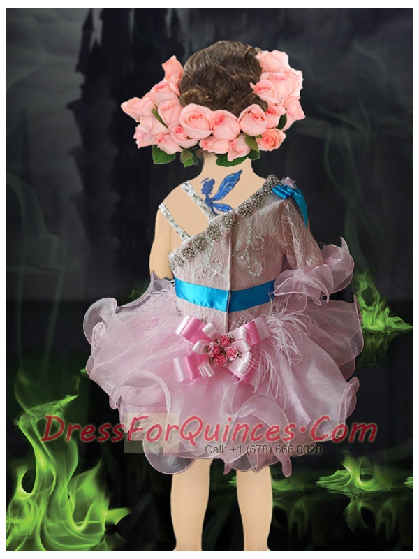 Asymmetrical Baby Pink Mini-length Little Girl Dress with Sashes and Ruffles
