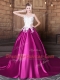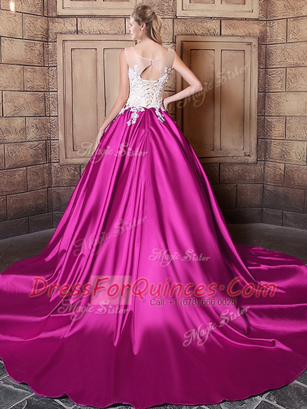 Amazing Scoop Fuchsia Elastic Woven Satin Lace Up Vestidos de Quinceanera Sleeveless With Train Court Train Appliques