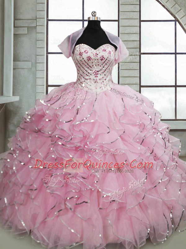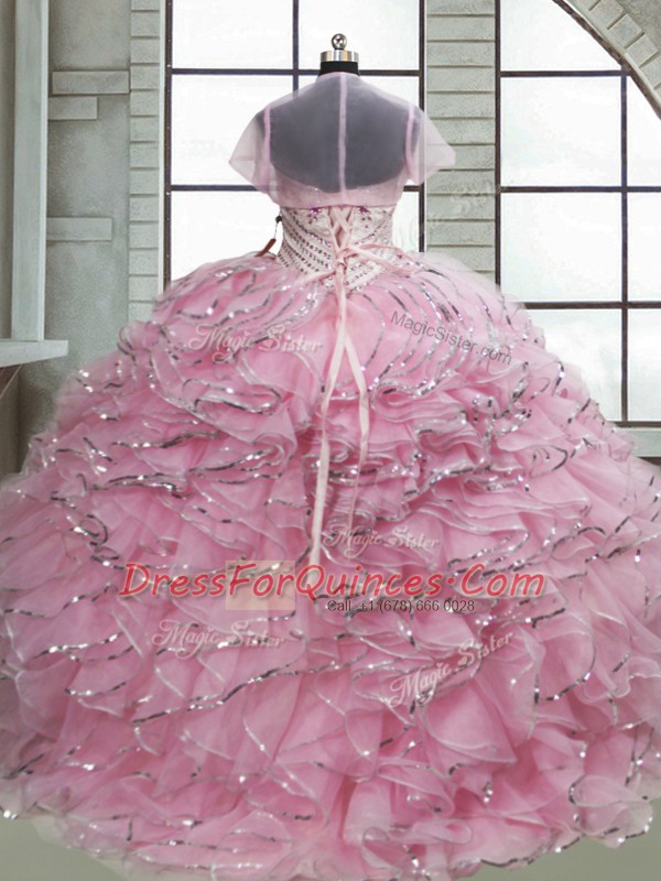 Ball Gowns Sleeveless Baby Pink 15 Quinceanera Dress Brush Train Lace Up