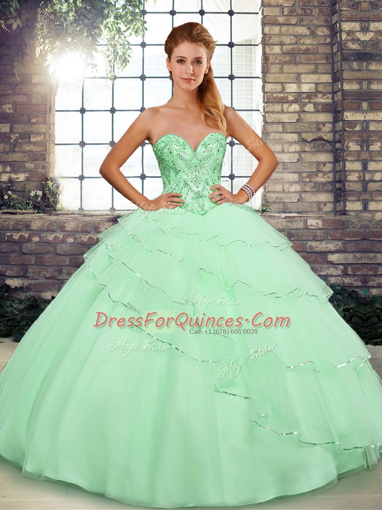 Best Selling Apple Green Lace Up Sweetheart Beading and Ruffled Layers Quince Ball Gowns Tulle Sleeveless Brush Train