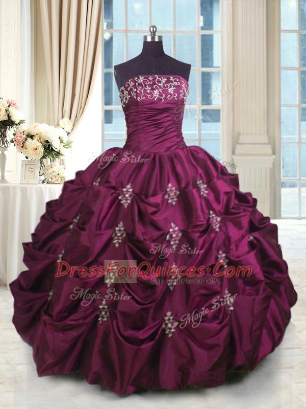 Burgundy Strapless Neckline Beading and Appliques and Embroidery and Pick Ups Vestidos de Quinceanera Sleeveless Lace Up