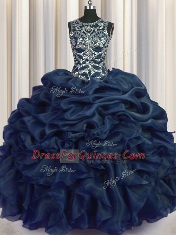 Charming Scoop Pick Ups Navy Blue Sleeveless Organza Lace Up Vestidos de Quinceanera for Military Ball and Sweet 16 and Quinceanera