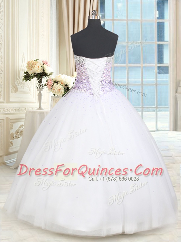 Classical White Ball Gowns Beading Quinceanera Gown Lace Up Tulle Sleeveless Floor Length
