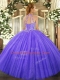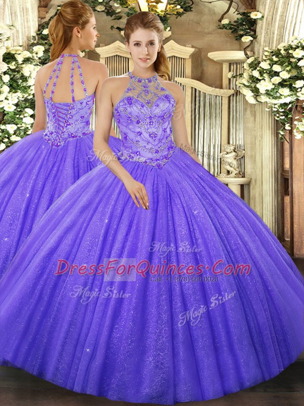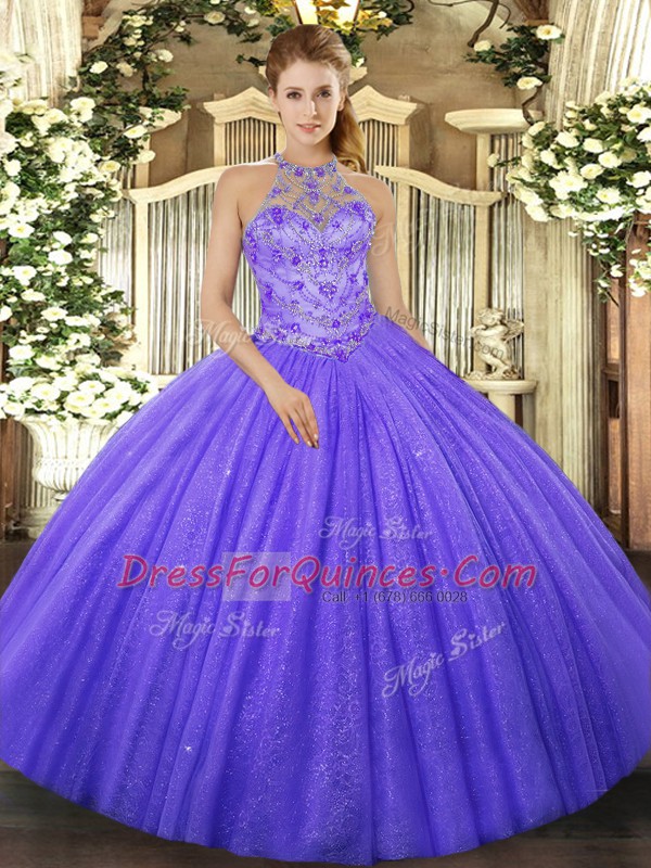Custom Design Lavender Tulle Lace Up Quinceanera Dresses Sleeveless Floor Length Beading and Embroidery