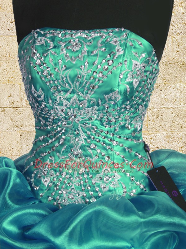 Decent Turquoise Lace Up Strapless Beading and Ruffles Quinceanera Gown Organza and Taffeta Sleeveless